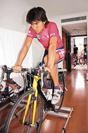 按計(jì)劃,“阿寶”與黃蘊(yùn)瑤今天本應(yīng)進(jìn)行公路訓(xùn)練,但因天雨以及單車館內(nèi)有其它車隊(duì)正在訓(xùn)練的關(guān)系,唯有在室內(nèi)器械上進(jìn)行練習(xí)。其中“阿寶”邊練邊反復(fù)觀看錄像帶!八诳慈ツ辍眠\(yùn)北京’測(cè)試賽的錄像,16日的比賽,我們打算以測(cè)試賽的戰(zhàn)術(shù)為藍(lán)本,他反復(fù)地看,已不知看多少次了!鄙蚪叹毥忉尩馈