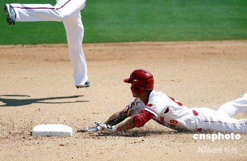 8月15日,北京奧運(yùn)會(huì)棒球男子預(yù)賽,中國(guó)隊(duì)與中華臺(tái)北隊(duì)的比賽在北京五棵松棒球場(chǎng)舉行,中國(guó)隊(duì)(白)最終在延長(zhǎng)局以8:7戰(zhàn)勝中華臺(tái)北隊(duì)。中新社發(fā) 盛佳鵬 攝