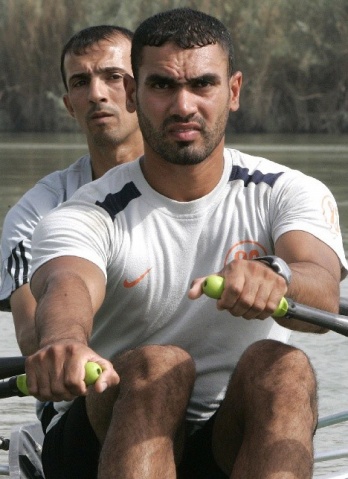 伊拉克賽艇運動員穿著舊T恤比賽。