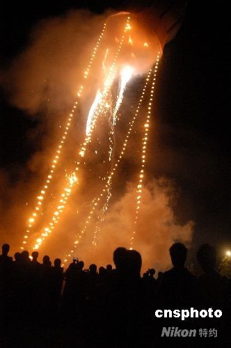 放孔明燈是海南群眾中元節(jié)的傳統(tǒng)習俗,萬寧市后安鎮(zhèn)下港村民以制作巨型孔明燈聞名。繼2007年“下港六號”孔明燈成功放飛之后,今年該村村民又打造了“下港七號”孔明燈。這個孔明燈直徑達21米,高28米,采用特制白紙1680張,重約500公斤,耗資5萬元制作而成。燈體上寫著“下港村民為中國加油”、“預祝奧運取得圓滿成功”等字樣,中元節(jié)當晚經過兩次燃放終于成功升空。