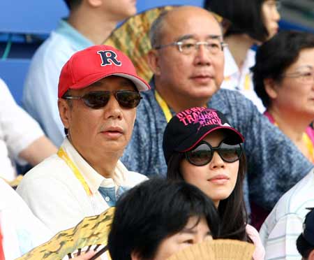 2008北京奧運(yùn)會(huì)棒球賽13日在五棵松體育中心舉行中華臺(tái)北隊(duì)對(duì)荷蘭隊(duì)的揭幕戰(zhàn),鴻海集團(tuán)董事長(zhǎng)郭臺(tái)銘(左)和妻子曾馨瑩也到場(chǎng)看球。(上圖)