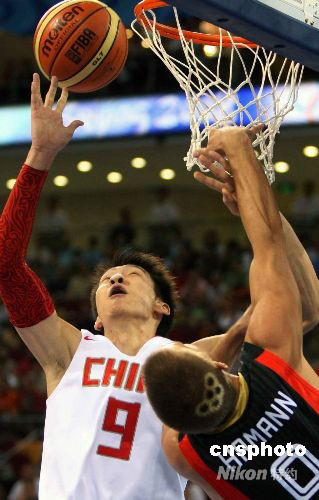 8月16日,北京奧運(yùn)會(huì)男子籃球小組賽第四輪比賽在五棵松籃球館舉行,最終由姚明率領(lǐng)的中國(guó)隊(duì)?wèi)?zhàn)勝由諾維斯基、卡曼率領(lǐng)的德國(guó)隊(duì),挺進(jìn)8強(qiáng)。中新社發(fā) 任晨鳴 攝