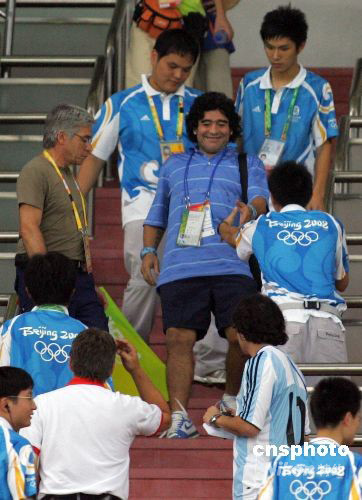 8月16日,北京奧運(yùn)會(huì)男足,阿根廷VS荷蘭的比賽在上海體育場進(jìn)行。球王馬拉多納親臨上海為阿根廷加油助威。中新社發(fā) 湯彥俊 攝