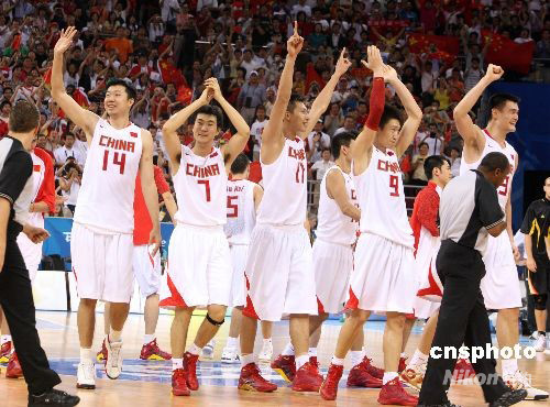 8月16日,北京奧運(yùn)會(huì)男子籃球小組賽第四輪比賽在五棵松籃球館舉行。最終,中國隊(duì)以59比55艱難戰(zhàn)勝德國隊(duì),提前鎖定奧運(yùn)會(huì)8強(qiáng)席位。其中,姚明獲得全場(chǎng)最高的25分。中新社發(fā) 任晨鳴 攝