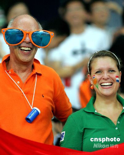 8月16日,北京奧運(yùn)會男足阿根廷對陣荷蘭的比賽在上海體育場進(jìn)行。一位荷蘭球迷帶著一副巨型眼鏡在比賽現(xiàn)場觀看比賽,吸引了不少好奇的目光。中新社發(fā) 湯彥俊 攝