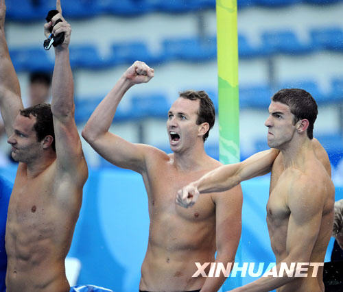 8月17日,菲爾普斯領(lǐng)銜的美國(guó)隊(duì)以3分29秒34的成績(jī)打破世界紀(jì)錄并奪得金牌。這是菲爾普斯繼男子400米個(gè)人混合泳、男子4x100米自由泳接力、男子200米自由泳、男子200米蝶泳、男子4x200米自由泳接力、男子200米個(gè)人混合泳和男子100米蝶泳之后,收獲的第八枚北京奧運(yùn)會(huì)金牌,打破前輩施皮茨在1972年慕尼黑奧運(yùn)會(huì)上創(chuàng)造的一屆拿七塊金牌的紀(jì)錄。 新華社記者 陳凱攝