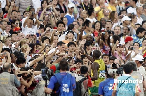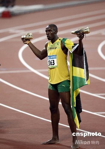 2008年8月16日,在北京奧運(yùn)會(huì)男子百米比賽中,牙買加選手博爾特以9秒69奪得冠軍,并刷新了世界紀(jì)錄。中新社發(fā) 盛佳鵬 攝