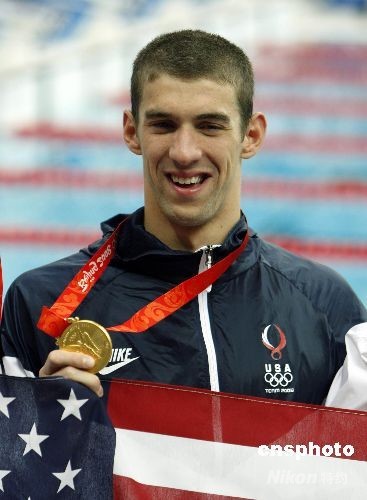 8月17日,美國隊獲得北京奧運會男子4乘100米混合泳接力冠軍,至此,23歲的美國游泳運動員菲爾普斯不僅用8金刷新了單屆奧運會金牌紀(jì)錄,而且還將個人所有奧運會的金牌總數(shù)提高到了14枚,達成了他人難以超越的“世界紀(jì)錄”。中新社發(fā) 杜洋 攝