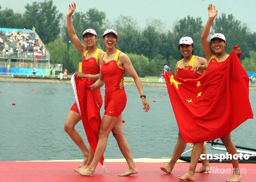 中國(guó)組合唐賓、金紫薇、奚愛(ài)華、張楊楊在北京奧運(yùn)會(huì)賽艇女子四人雙槳決賽中以6分15秒95的成績(jī)超越英國(guó)、德國(guó)等世界名將獲得冠軍,取得了歷史性的突破。