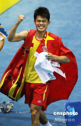 林丹慶祝收獲奧運(yùn)羽毛球男單金牌。中新社發(fā) 武仲林 攝