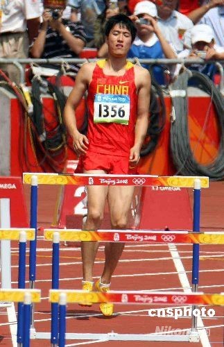8月18日上午,在北京奧運男子110米欄第1輪第6組比賽中,中國選手劉翔在第一次起跑后因腿傷遺憾退出比賽。中新社發(fā) 任晨鳴 攝