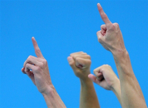 菲爾普斯和他的隊(duì)友們?cè)?×200米自由泳接力摘金后慶祝。