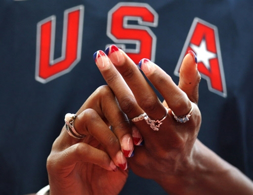 一位美國隊員在女子400米預賽的賽道上整理自己的手飾,可見這個隊員還是個“時尚先鋒”。