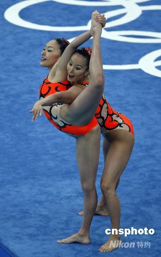 8月18日,北京奧運(yùn)會(huì)花樣游泳比賽在“水立方”拉開帷幕,在首場(chǎng)比賽雙人技術(shù)自選項(xiàng)目中,日本選手原田早穗、鈴木繪美子以48.250的總分排名第三位。中新社發(fā) 杜洋 攝