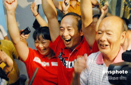 何雯娜父母在福建龍巖東城區(qū)家中為女兒奪得奧運(yùn)冠軍歡呼。 中新社發(fā) 林風(fēng) 攝