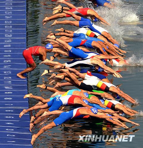 8月19日,中國(guó)香港選手李致和在出發(fā)入水時(shí)比其他選手慢了半拍。 當(dāng)日,北京奧運(yùn)會(huì)鐵人三項(xiàng)男子組決賽在北京十三陵水庫(kù)舉行。新華社記者王毓國(guó)攝