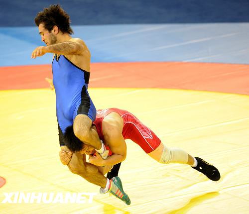 8月19日,在北京奧運會摔跤男子自由式60公斤級1/8決賽中,前南馬其頓選手穆拉德·拉馬扎諾夫(藍)戰(zhàn)勝韓國選手金鐘大。新華社記者李鋼攝