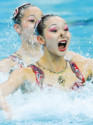 18日下午,北京奧運(yùn)會(huì)花樣游泳比賽在“水立方”迎來第一個(gè)比賽日。第一輪雙人技術(shù)自選動(dòng)作的比賽結(jié)束后,俄羅斯隊(duì)的奧運(yùn)會(huì)和世錦賽雙料冠軍達(dá)維多娃/葉爾馬科娃憑借絕對(duì)的優(yōu)勢(shì),以49.334分排在第一位,中國(guó)選手蔣文文/蔣婷婷以48.084分排在第四位。
