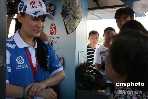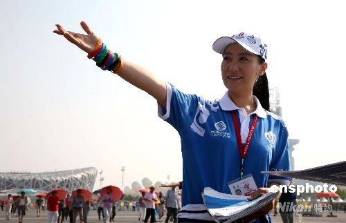 八月十九日,中國著名歌唱家譚晶在“鳥巢”八號安檢口旁的城市志愿者服務站為路人指路;钴S在北京各大場館、街道的一百七十萬各種志愿者,連日來受到國內外各大媒體的贊揚,北京官方八月十八日也高度贊揚他們表現(xiàn)出極高的專業(yè)水準。中新社發(fā) 吳慶才 攝