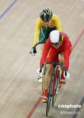 8月19日,2008北京奧運會場地自行車女子爭先賽半決賽在老山自行車館進行,中國自行車“希望之星”郭爽因第三戰(zhàn)決勝戰(zhàn)因為與對手米亞雷斯有身體接觸犯規(guī)被處罰取消成績,因此遭逆轉(zhuǎn)惜敗無緣決賽,只能與荷蘭選手卡尼斯?fàn)帄Z銅牌。中新社發(fā) 武仲林 攝