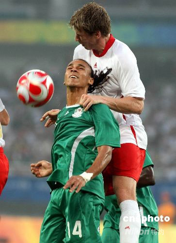 8月19日,北京奧運會男足半決賽,尼日利亞對比利時的比賽在上海體育場進(jìn)行。最終,尼日利亞隊以4:1戰(zhàn)勝比利時晉級奧運男足決賽。圖為尼日利亞14號彼得·奧登文吉(綠衣)與比利時球員爭搶頭球。 中新社發(fā) 湯彥俊 攝