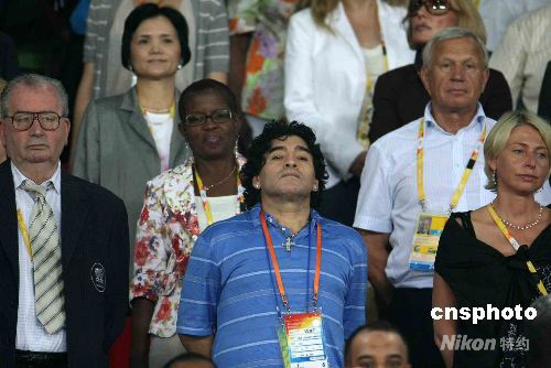 8月19日晚,北京奧運(yùn)會男足第二場半決賽在北京工人體育場舉行,球王馬拉多納到場觀看巴西、阿根廷兩強(qiáng)遭遇戰(zhàn)。 中新社發(fā) 任晨鳴 攝