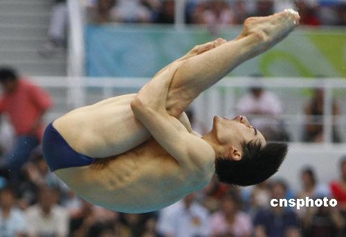 8月19日晚,北京奧運(yùn)男子3米跳板決賽在國家游泳館“水立方”舉行,中國選手秦凱以572.90分獲得銅牌。他的隊(duì)友何沖以572.90分奪取金牌。 中新社發(fā) 杜洋 攝