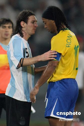 8月19日晚,北京奧運會男足第二場半決賽在北京工人體育場舉行,由球星梅西領(lǐng)銜的阿根廷隊以3比0淘汰巴西隊進入決賽。賽后,梅西與巴西隊隊長羅納爾迪尼奧擁抱并安慰這位好友。 中新社發(fā) 任晨鳴 攝
