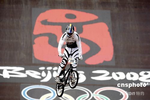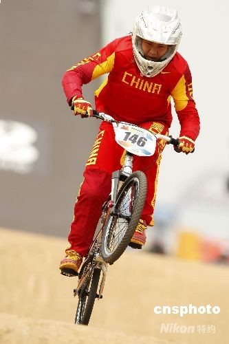 8月20日,北京奧運(yùn)會(huì)小輪車比賽在老山小輪車賽場(chǎng)展開較量。在女子競(jìng)速計(jì)時(shí)賽的兩輪排位賽中,中國選手馬麗蕓排在最后一位,被分在了半決賽的第一組。圖為馬麗蕓在比賽中。