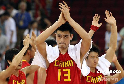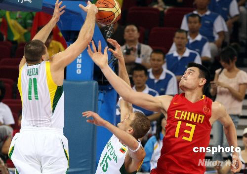 北京奧運(yùn)會(huì)男子籃球四分之一淘汰賽8月20日在五棵松籃球館開戰(zhàn),中國隊(duì)在與歐洲勁旅立陶宛隊(duì)的拼殺中終因?qū)嵙Σ粷?jì)以68比94告負(fù),無緣北京奧運(yùn)會(huì)四強(qiáng),立陶宛隊(duì)進(jìn)入奧運(yùn)會(huì)男籃四強(qiáng)。超級(jí)中鋒姚明上場33分鐘,砍下全隊(duì)最高的19分。 中新社發(fā) 任晨鳴 攝