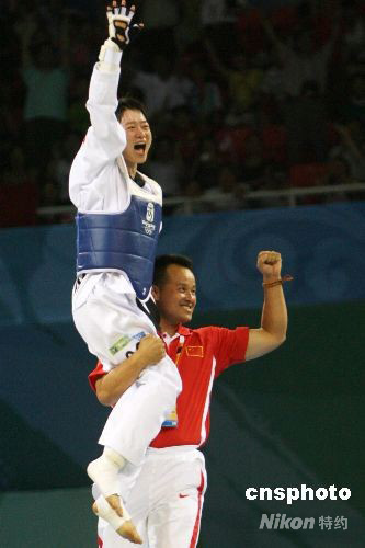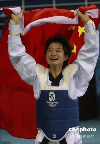 8月20日晚,21歲的中國姑娘吳靜鈺(左)在北京奧運會跆拳道女子49公斤以下級冠亞軍決戰(zhàn)中,以1:-1戰(zhàn)勝泰國選手布特蕾·貝德蓬勇奪金牌,成為中國跆拳道在本屆奧運會上奪得的第一枚金牌,中國體育代表團(tuán)金牌總數(shù)達(dá)到45枚。 中新社發(fā) 武仲林 攝