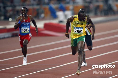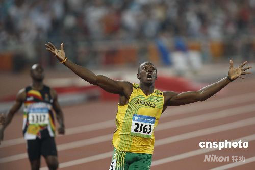 8月20日晚,國家體育場舉行的北京奧運會男子200米決賽中,牙買加選手尤塞恩·博爾特以19.30創(chuàng)造新的世界紀(jì)錄并獲得金牌。這是他在本屆奧運會上繼百米金牌后奪得的第二枚金牌。 中新社發(fā) 盛佳鵬 攝