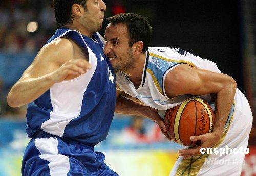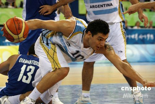 北京奧運(yùn)會男籃最后一場八進(jìn)四比賽,8月20日午夜時分在五棵松籃球館舉行,南美洲冠軍、雅典奧運(yùn)會冠軍阿根廷隊以80比78驚險戰(zhàn)勝歐洲勁旅希臘隊,進(jìn)入前四名。阿根廷隊將與美國“夢八隊”爭奪決賽權(quán)。隊中“老大”、在NBA馬刺隊效力的球星吉諾比利不僅砍下全場最高的24分,而且在最后時刻投中關(guān)鍵一球;另一名球星10號德爾菲諾(DELFINO Carios Francisco)砍下23分。中新社發(fā) 任晨鳴 攝