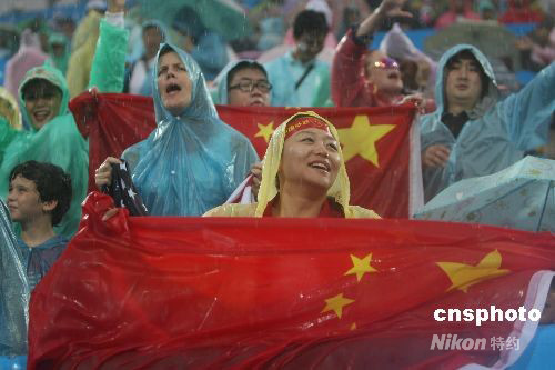 8月21日,中國(guó)選手田佳、王潔在奧運(yùn)沙灘排球決賽中以0 :2負(fù)于美國(guó)選手克麗·沃爾什、米絲蒂· 梅—特雷納,獲得亞軍。圖為觀眾冒雨為運(yùn)動(dòng)員助威。中新社發(fā) 武仲林 攝