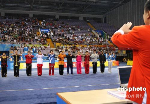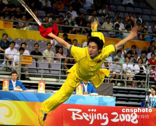 8月21日,“北京2008武術(shù)比賽”在北京奧林匹克體育中心體育館拉開(kāi)帷幕。“北京2008武術(shù)比賽”經(jīng)國(guó)際奧委會(huì)批準(zhǔn),由北京奧組委、國(guó)際武術(shù)聯(lián)合會(huì)主辦,中國(guó)武術(shù)協(xié)會(huì)承辦,于8月21日至24日在北京舉行。比賽設(shè)套路10枚金牌、散手5枚金牌。有來(lái)自世界五大洲43個(gè)國(guó)家和地區(qū)的128名男女運(yùn)動(dòng)員參加比賽。為了使更多國(guó)家和地區(qū)的運(yùn)動(dòng)員在本次比賽中獲得獎(jiǎng)牌,國(guó)際武術(shù)聯(lián)合會(huì)做出了在15個(gè)比賽項(xiàng)目中,每個(gè)國(guó)家和地區(qū)最多只能參加8項(xiàng)的規(guī)定。中新社發(fā) 宋吉河 攝