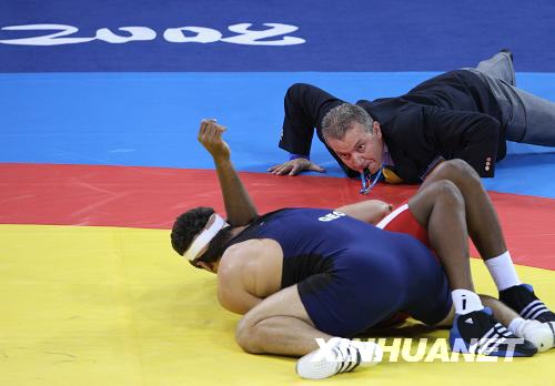 8月21日,在北京奧運(yùn)會(huì)摔跤男子自由式96公斤級(jí)銅牌決賽中,格魯吉亞選手喬治·戈格舍利澤(藍(lán))戰(zhàn)勝古巴選手米歇爾·巴蒂斯塔,獲得銅牌。裁判為了看清楚也趴到摔跤臺(tái)上。新華社記者李鋼攝