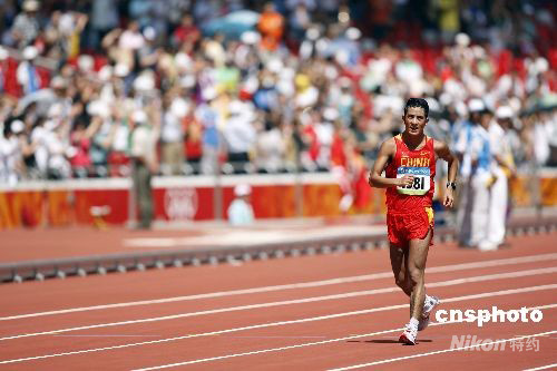8月22日上午,北京奧運男子50公里競走比賽中,意大利選手亞歷克斯-施瓦策以3小時37分09秒奪得冠軍。中國選手李建波雖奮力追趕,但還是無緣獎牌。 中新社發(fā) 盛佳鵬 攝