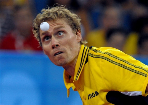 8月22日,瑞典名將佩爾森在奧運(yùn)乒乓球男子單打四分之一比賽中的發(fā)球聚精會(huì)神。