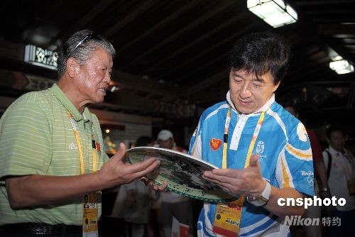 8月22日下午,曾任中共中央政治局委員、國務委員、全國人大常委會副委員長的李鐵映,與巨星成龍在北京奧林匹克公園祥云小屋共同欣賞名貴瓷器。中新社發(fā) 陳文 攝