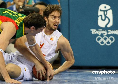 北京奧運(yùn)會(huì)男子籃球半決賽首場(chǎng)比賽8月22日晚在五棵松籃球館開(kāi)戰(zhàn),2006年世錦賽冠軍西班牙隊(duì)以91比86艱難戰(zhàn)勝極為強(qiáng)悍的立陶宛隊(duì),率先進(jìn)入決賽。NBA球星4號(hào)保羅·加索爾砍下全場(chǎng)最高的19分。 中新社發(fā) 任晨鳴 攝