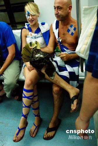 8月22日晚,一身披希臘國旗、頭戴古希臘“勇士”頭盔的希臘男子和一名身披希臘國旗的希臘姑娘在北京地鐵10號線搭乘地鐵,引來周邊眾多乘客好奇的目光。中新社發(fā) 楊慧峰 攝