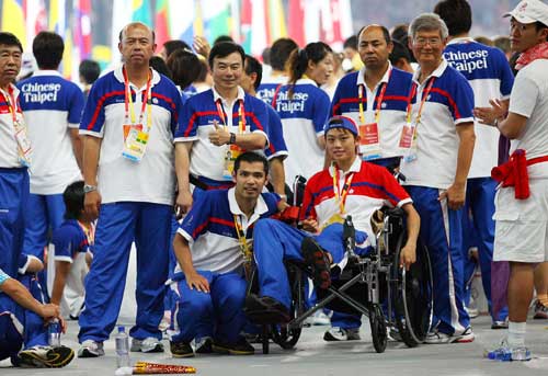北京奧運(yùn)二十四日晚間圓滿閉幕。中華臺北代表團(tuán)七十多名隊(duì)職員參加閉幕式,備受矚目的跆拳道好手蘇麗文(前排右)坐著輪椅,由隊(duì)友推進(jìn)場,成為中華臺北隊(duì)最受歡迎的選手。(“中央社”圖)