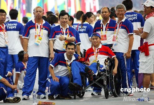 8月24日晚,北京奧運(yùn)會(huì)圓滿閉幕。中華臺(tái)北代表團(tuán)70多名隊(duì)員參加閉幕典禮,備受關(guān)注的跆拳道好手蘇麗文(前排右)坐著輪椅,由隊(duì)友推進(jìn)場(chǎng),成為中華臺(tái)北隊(duì)最受歡迎的選手。 中新社發(fā) CNAsports 攝