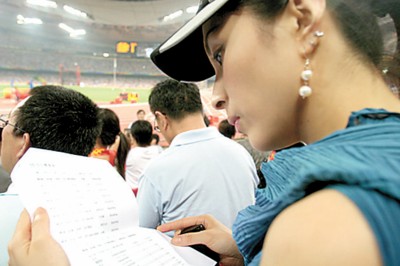 在鳥巢觀看女子撐桿跳高決賽的湯燦,瞧這架勢,似乎很專業(yè),還準備了一份小資料,在研究什么呢?
