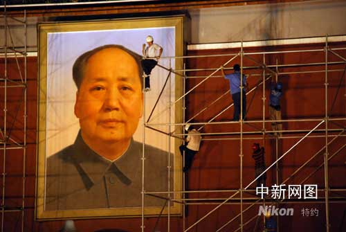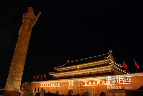 8月25日晚,為迎接殘奧會,工人們正對天安門城樓進行重新裝修。據(jù)工作人員介紹,目前天安門城樓上搭建的腳手架主要是為了進行城樓外墻的粉刷。(楊慧峰/攝影)