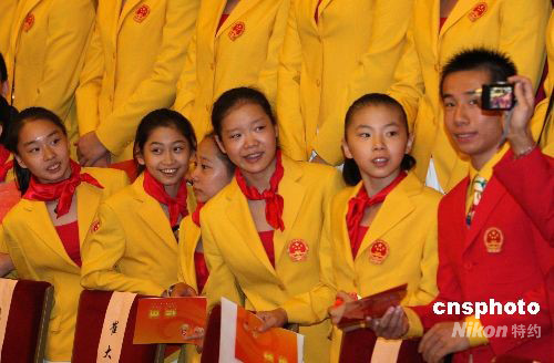 8月26日,2008年北京奧運(yùn)會(huì)中國體育代表團(tuán)總結(jié)大會(huì)在北京人民大會(huì)堂金色大廳舉行。女子體操運(yùn)動(dòng)員參加北京奧運(yùn)會(huì)中國體育代表團(tuán)總結(jié)大會(huì)。 中新社發(fā) 廖文靜 攝