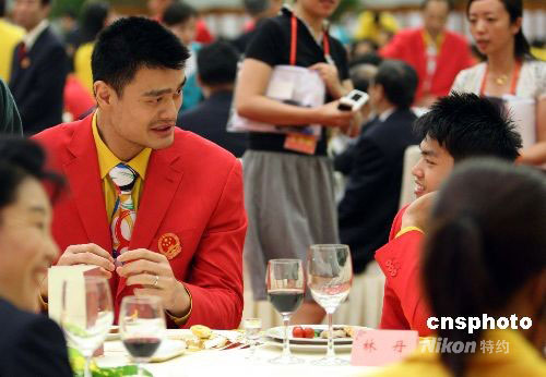 姚明、林丹參加北京奧運中國體育代表團慶祝宴會。中新社發(fā) 廖文靜 攝