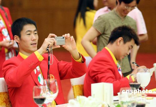 王勵(lì)勤、王皓參加北京奧運(yùn)中國(guó)體育代表團(tuán)慶祝宴會(huì)。 中新社發(fā) 廖文靜 攝