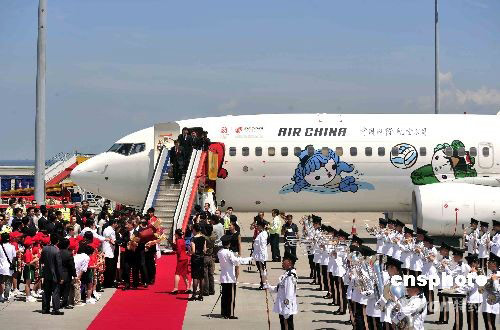 八月二十九日上午十一時(shí),中國(guó)國(guó)家奧運(yùn)金牌運(yùn)動(dòng)員代表團(tuán)的六十三名成員乘坐飛機(jī)抵達(dá)香港機(jī)場(chǎng),特區(qū)行政長(zhǎng)官曾蔭權(quán)等官員到場(chǎng)迎接。 中新社發(fā) 譚達(dá)明 攝