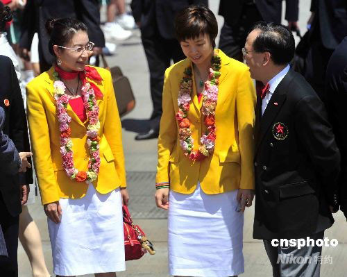 八月二十九日上午十一時(shí),中國(guó)國(guó)家?jiàn)W運(yùn)金牌運(yùn)動(dòng)員代表團(tuán)的六十三名成員乘坐飛機(jī)抵達(dá)香港機(jī)場(chǎng),特區(qū)行政長(zhǎng)官曾蔭權(quán)等官員到場(chǎng)迎接。圖為郭晶晶(左)與張怡寧在機(jī)場(chǎng)受到特首曾蔭權(quán)的歡迎。中新社發(fā) 譚達(dá)明 攝